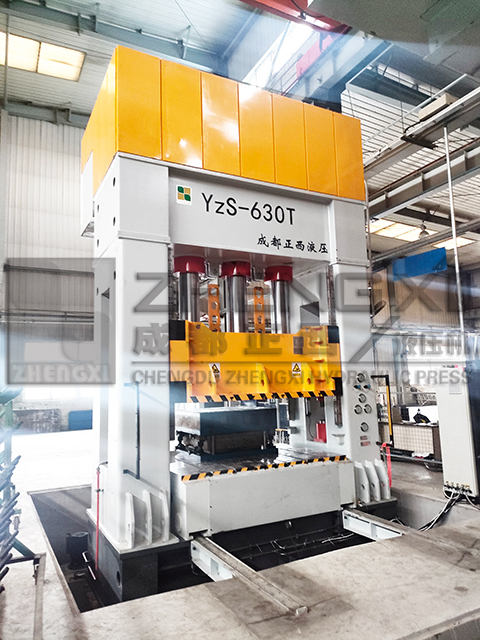 图片显示是630吨液压机在客户安装后的现场,从下向上,能看到移动换模平台,这也是客户特意要求的,加上这个可以更好换模具,正西在生产每一个部件都是严格按照客户需求来生产,